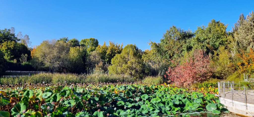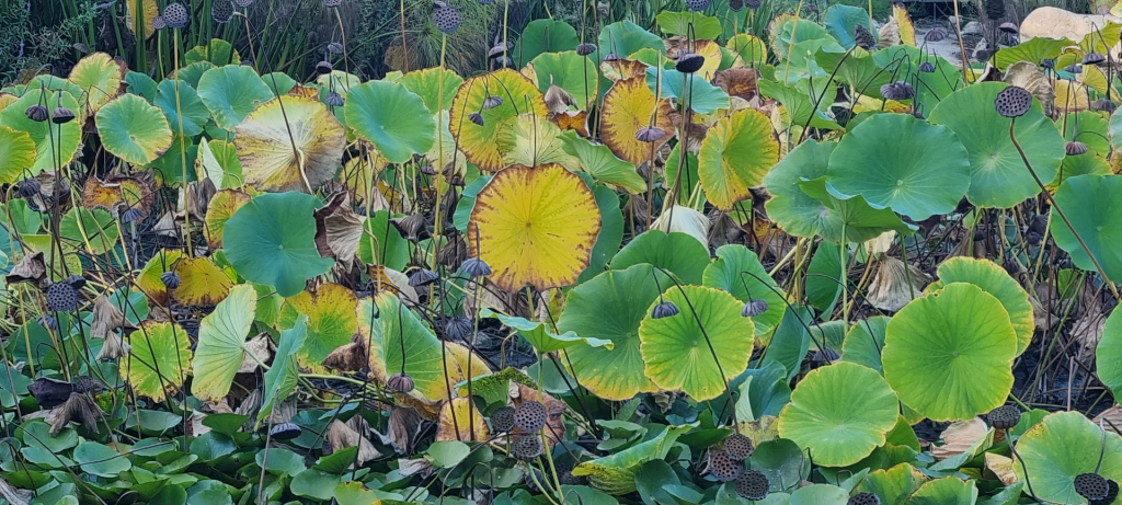 In the Jerusalem Botanical Gardens, the pond lilies are changing colors as they wilt away.