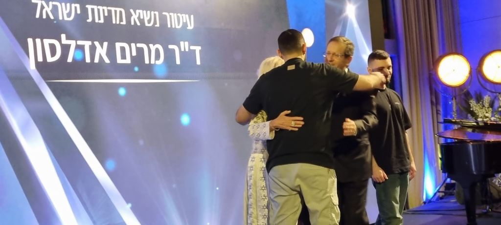 Group hug of the President, Adelson, and freed hostages Matan Angrest and Segev Kalfon was another.