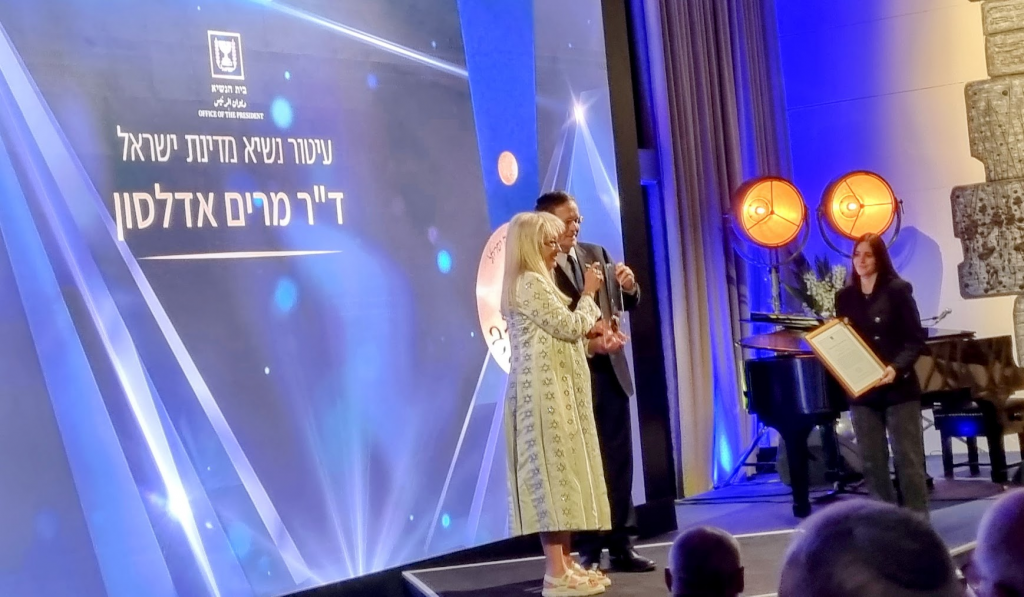 Dr. Miriam Adelson, one of the female winners, spoke for the group and wore a white garment with blue Stars of David embroidery.
