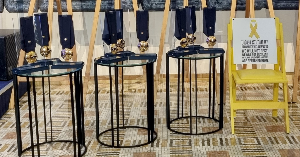 The yellow chair to remember the hostages still in Gaza was placed next to the medals.