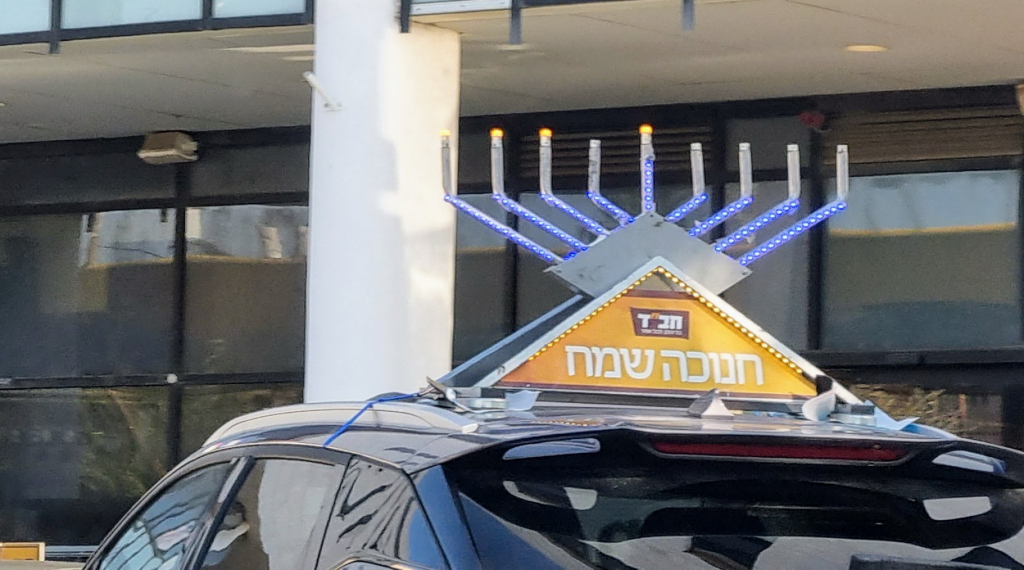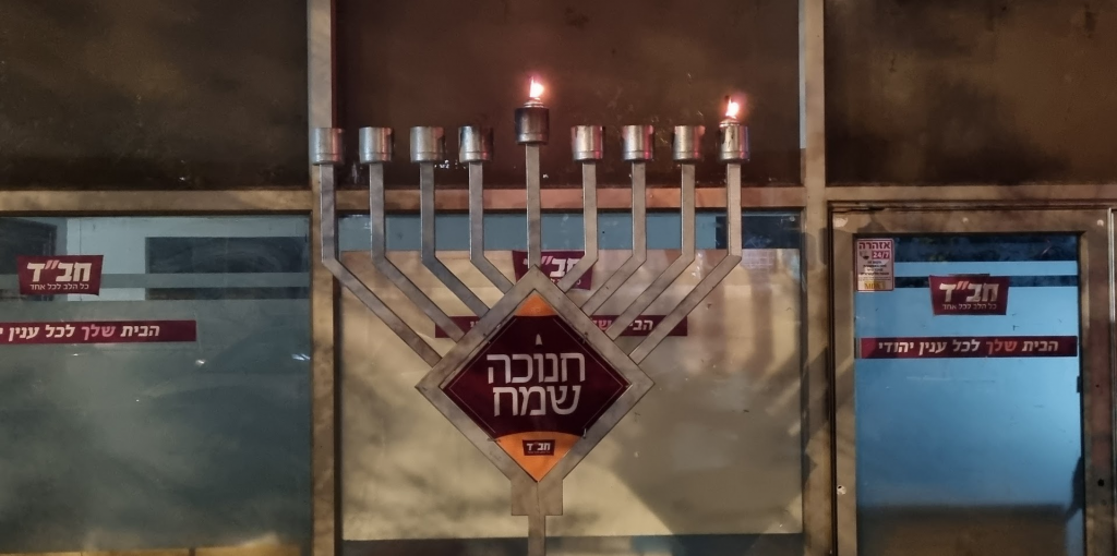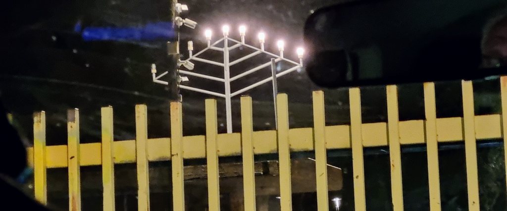 It was the fifth night of Hannukkah, and the lights were lit on the security fence.