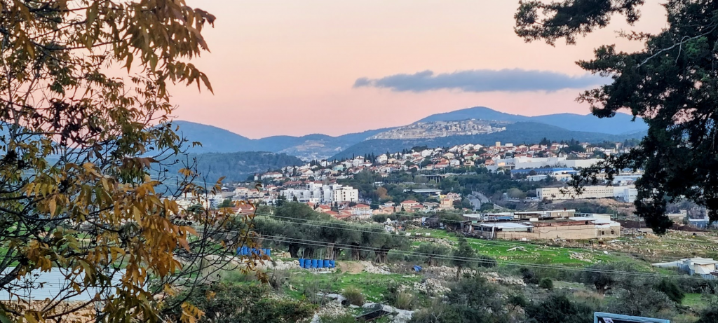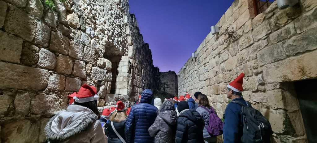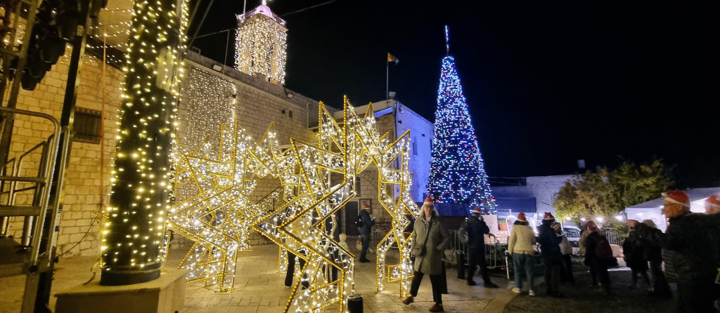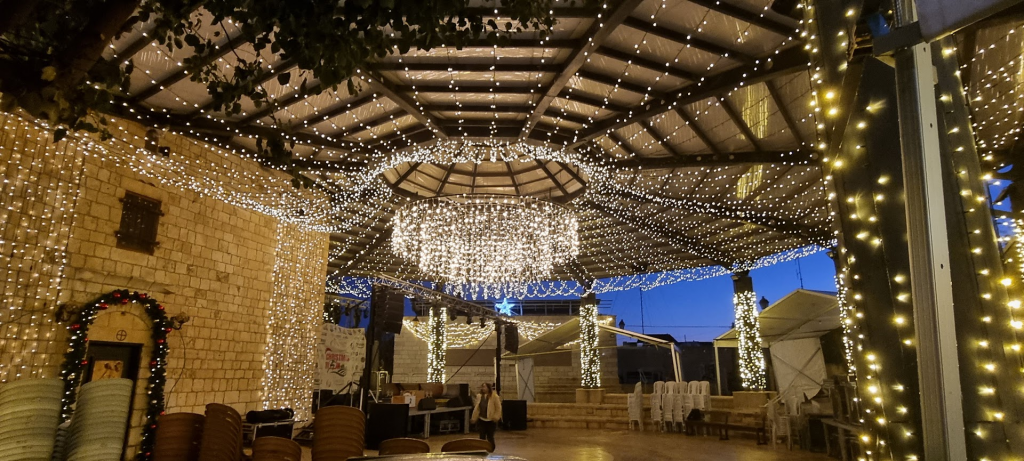 The holiday lights were on in the Christian village of Mi’ilya as the sky went dark.