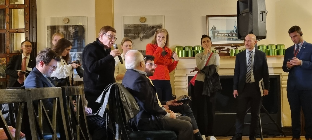 The Israeli journalist spoke in German, as the translator concentrated on relaying his question.