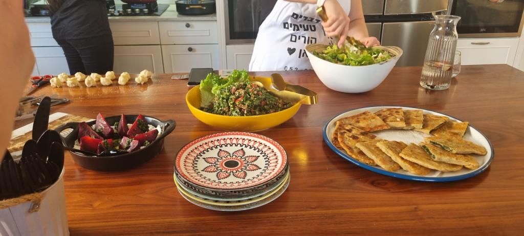 Our first stop was in Moreshet, where a food workshop is held in a Jewish woman’s home. She partners with a Druze woman, who is also a professional chef, delivering a fabulous dairy meal. The brownies were in the oven for dessert. Sorry, no photos, they disappeared too quickly, and we were on our way.