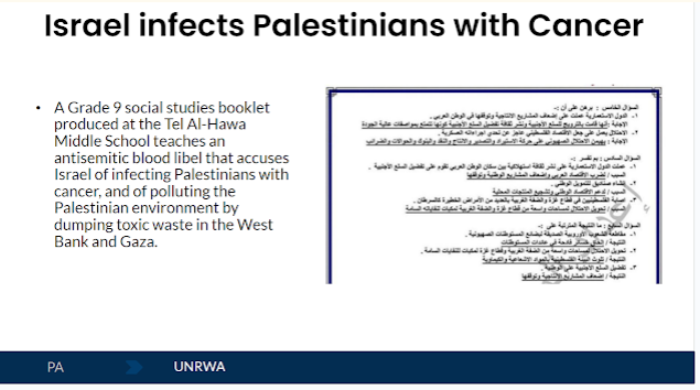 UNRWA for social studies in middle school accuses Israel of infecting Palestinians with cancer.