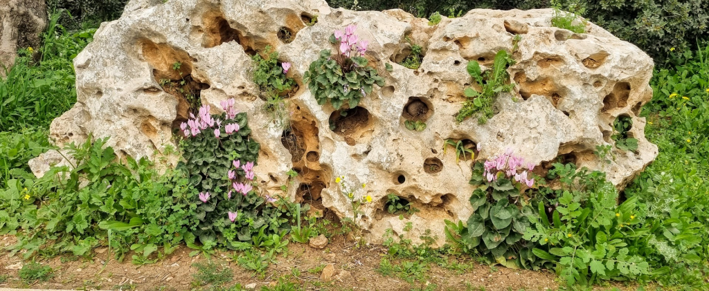 In February in Jerusalem, the flowers pop out of the ancient stones.