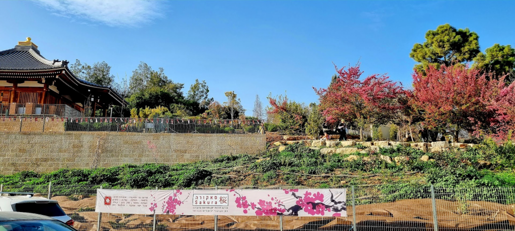 The cherry trees near the Japanese Pagoda were filled with pink blossoms in the Jerusalem Botanical Gardens.