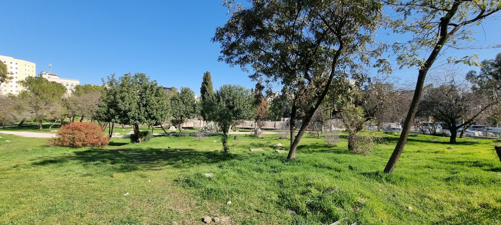 It’s across from Gan Haatzmaut, Independence Park, next to Mamilla Cemetery. The winter rain has turned it green.